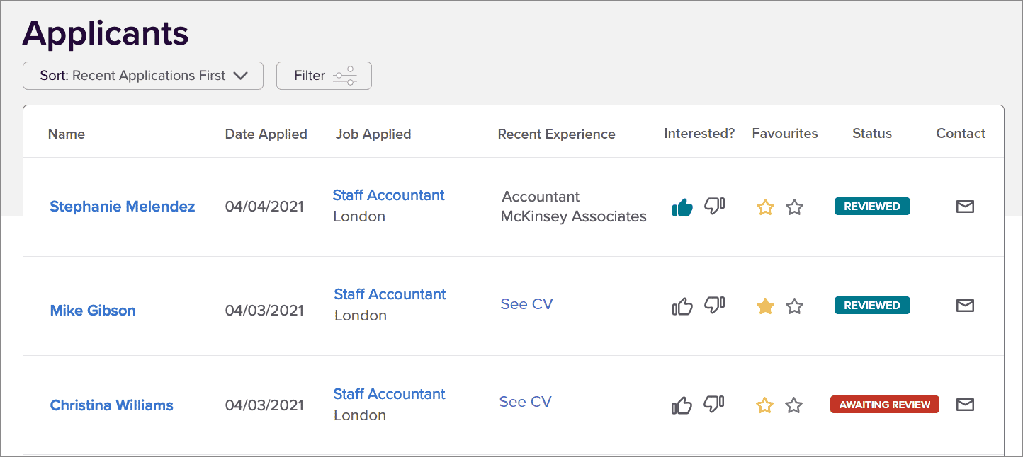 - Favourites – Using the gold or silver stars will mark the applicant as favourite.